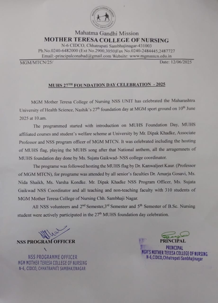 MGM Mother Teresa College of Nursing National Service Scheme Unit was Started from 5th April